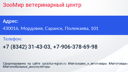 ЗооМир, ветеринарный центр по адресу 430016, Мордовия, Саранск, Полежаева, 101 в дальнейшем Организация, размещена в следующих категориях: