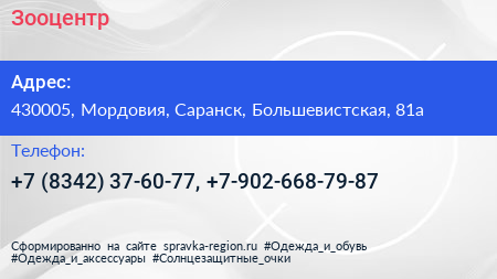 Зооцентр по адресу 430005, Мордовия, Саранск, Большевистская, 81а в дальнейшем Организация, размещена в следующих категориях: