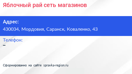 Яблочный рай, сеть магазинов по адресу 430034, Мордовия, Саранск, Коваленко, 43 в дальнейшем Организация, размещена в следующих категориях: