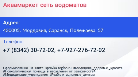 Аквамаркет, сеть водоматов по адресу 430005, Мордовия, Саранск, Полежаева, 57 в дальнейшем Организация, размещена в следующих категориях: