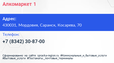 Алкомаркет №1 по адресу 430031, Мордовия, Саранск, Косарева, 70 в дальнейшем Организация, размещена в следующих категориях: