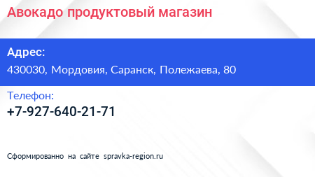 Авокадо, продуктовый магазин по адресу 430030, Мордовия, Саранск, Полежаева, 80 в дальнейшем Организация, размещена в следующих категориях: