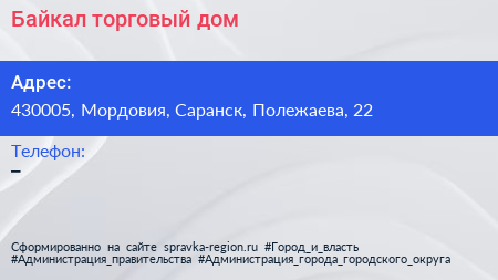 Байкал, торговый дом по адресу 430005, Мордовия, Саранск, Полежаева, 22 в дальнейшем Организация, размещена в следующих категориях: