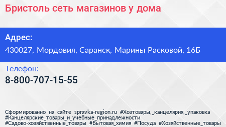 Бристоль, сеть магазинов у дома по адресу 430027, Мордовия, Саранск, Марины Расковой, 16Б в дальнейшем Организация, размещена в следующих категориях: