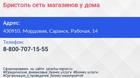 Бристоль, сеть магазинов у дома по адресу 430910, Мордовия, Саранск, Рабочая, 14 в дальнейшем Организация, размещена в следующих категориях: