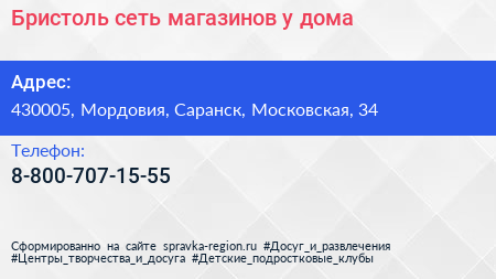 Бристоль, сеть магазинов у дома по адресу 430005, Мордовия, Саранск, Московская, 34 в дальнейшем Организация, размещена в следующих категориях: