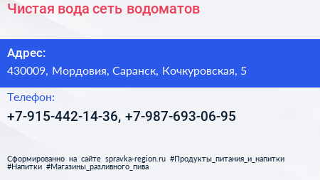 Чистая вода, сеть водоматов по адресу 430009, Мордовия, Саранск, Кочкуровская, 5 в дальнейшем Организация, размещена в следующих категориях: