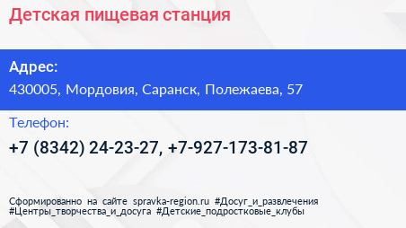 Детская пищевая станция по адресу 430005, Мордовия, Саранск, Полежаева, 57 в дальнейшем Организация, размещена в следующих категориях: