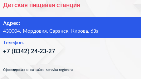 Детская пищевая станция по адресу 430004, Мордовия, Саранск, Кирова, 63а в дальнейшем Организация, размещена в следующих категориях: