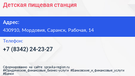Детская пищевая станция по адресу 430910, Мордовия, Саранск, Рабочая, 14 в дальнейшем Организация, размещена в следующих категориях: