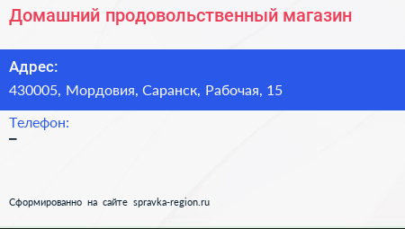 Домашний, продовольственный магазин по адресу 430005, Мордовия, Саранск, Рабочая, 15 в дальнейшем Организация, размещена в следующих категориях: