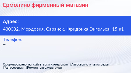 Ермолино, фирменный магазин по адресу 430032, Мордовия, Саранск, Фридриха Энгельса, 15 к1 в дальнейшем Организация, размещена в следующих категориях: