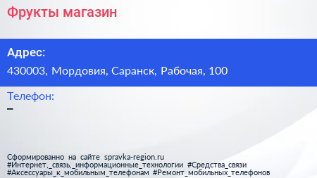 Фрукты, магазин по адресу 430003, Мордовия, Саранск, Рабочая, 100 в дальнейшем Организация, размещена в следующих категориях: