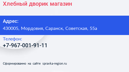 Хлебный дворик, магазин по адресу 430005, Мордовия, Саранск, Советская, 55а в дальнейшем Организация, размещена в следующих категориях: