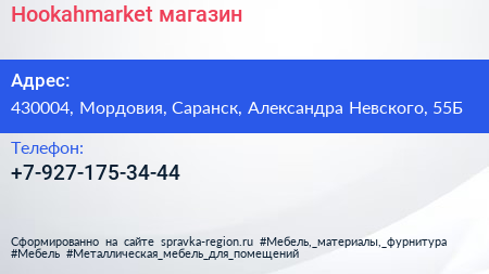 Hookahmarket, магазин по адресу 430004, Мордовия, Саранск, Александра Невского, 55Б в дальнейшем Организация, размещена в следующих категориях:
