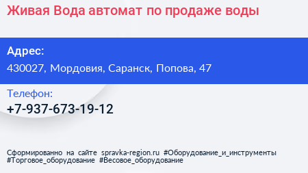Живая Вода, автомат по продаже воды по адресу 430027, Мордовия, Саранск, Попова, 47 в дальнейшем Организация, размещена в следующих категориях: