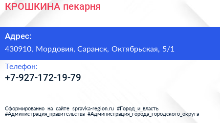 КРОШКИНА, пекарня по адресу 430910, Мордовия, Саранск, Октябрьская, 5/1 в дальнейшем Организация, размещена в следующих категориях:
