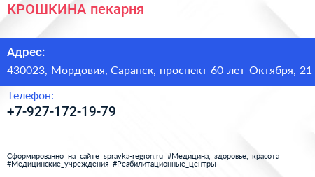 КРОШКИНА, пекарня по адресу 430023, Мордовия, Саранск, проспект 60 лет Октября, 21 в дальнейшем Организация, размещена в следующих категориях: