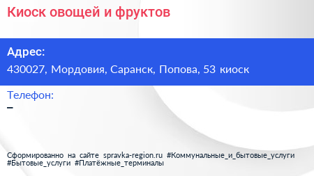 Киоск овощей и фруктов по адресу 430027, Мордовия, Саранск, Попова, 53 киоск в дальнейшем Организация, размещена в следующих категориях: