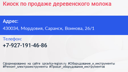 Киоск по продаже деревенского молока по адресу 430034, Мордовия, Саранск, Воинова, 26/1 в дальнейшем Организация, размещена в следующих категориях: