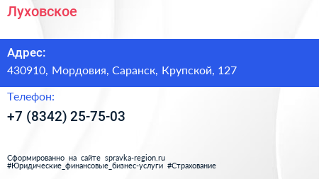 Луховское по адресу 430910, Мордовия, Саранск, Крупской, 127 в дальнейшем Организация, размещена в следующих категориях: