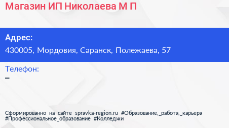 Магазин, ИП Николаева М.П. по адресу 430005, Мордовия, Саранск, Полежаева, 57 в дальнейшем Организация, размещена в следующих категориях: