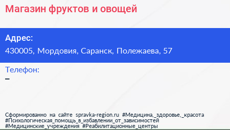 Магазин фруктов и овощей по адресу 430005, Мордовия, Саранск, Полежаева, 57 в дальнейшем Организация, размещена в следующих категориях: