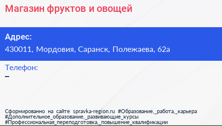 Магазин фруктов и овощей по адресу 430011, Мордовия, Саранск, Полежаева, 62а в дальнейшем Организация, размещена в следующих категориях: