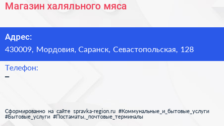 Магазин халяльного мяса по адресу 430009, Мордовия, Саранск, Севастопольская, 128 в дальнейшем Организация, размещена в следующих категориях: