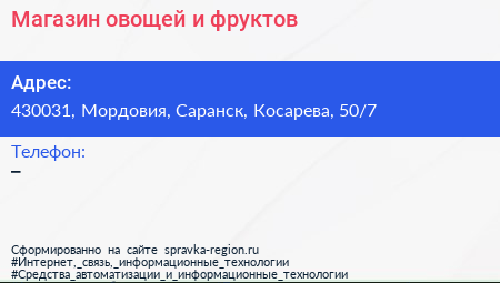 Магазин овощей и фруктов по адресу 430031, Мордовия, Саранск, Косарева, 50/7 в дальнейшем Организация, размещена в следующих категориях: