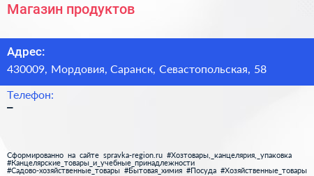 Магазин продуктов по адресу 430009, Мордовия, Саранск, Севастопольская, 58 в дальнейшем Организация, размещена в следующих категориях:
