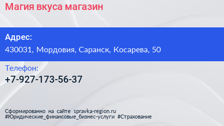 Магия вкуса, магазин по адресу 430031, Мордовия, Саранск, Косарева, 50 в дальнейшем Организация, размещена в следующих категориях:
