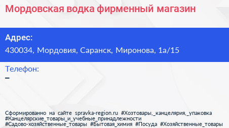 Мордовская водка, фирменный магазин по адресу 430034, Мордовия, Саранск, Миронова, 1а/15 в дальнейшем Организация, размещена в следующих категориях: