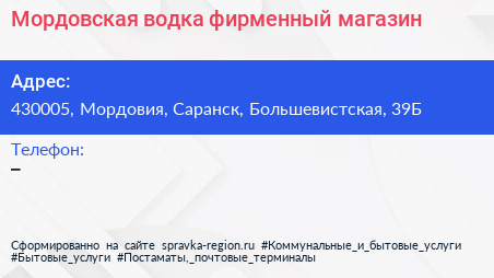 Мордовская водка, фирменный магазин по адресу 430005, Мордовия, Саранск, Большевистская, 39Б в дальнейшем Организация, размещена в следующих категориях: