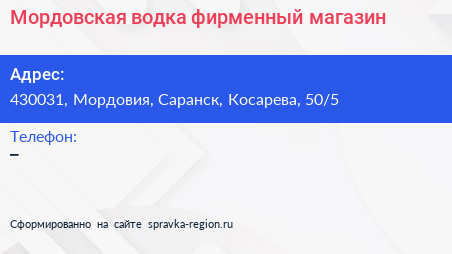 Мордовская водка, фирменный магазин по адресу 430031, Мордовия, Саранск, Косарева, 50/5 в дальнейшем Организация, размещена в следующих категориях: