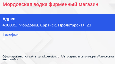 Мордовская водка, фирменный магазин по адресу 430005, Мордовия, Саранск, Пролетарская, 23 в дальнейшем Организация, размещена в следующих категориях: