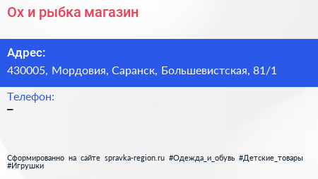 Ох и рыбка, магазин по адресу 430005, Мордовия, Саранск, Большевистская, 81/1 в дальнейшем Организация, размещена в следующих категориях: