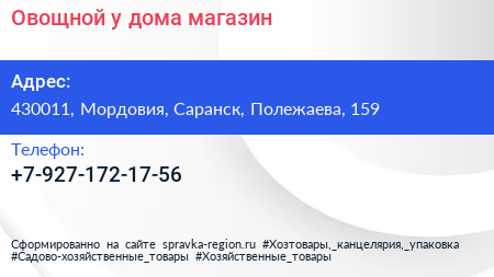 Овощной у дома, магазин по адресу 430011, Мордовия, Саранск, Полежаева, 159 в дальнейшем Организация, размещена в следующих категориях: