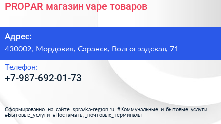 PROPAR, магазин vape-товаров по адресу 430009, Мордовия, Саранск, Волгоградская, 71 в дальнейшем Организация, размещена в следующих категориях: