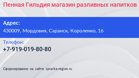 Пенная Гильдия, магазин разливных напитков по адресу 430009, Мордовия, Саранск, Короленко, 16 в дальнейшем Организация, размещена в следующих категориях:
