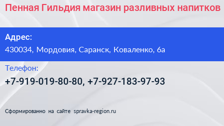 Пенная Гильдия, магазин разливных напитков по адресу 430034, Мордовия, Саранск, Коваленко, 6а в дальнейшем Организация, размещена в следующих категориях: