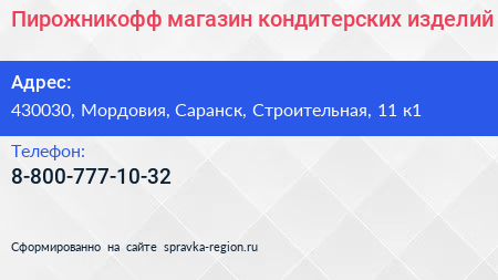 Пирожникофф, магазин кондитерских изделий по адресу 430030, Мордовия, Саранск, Строительная, 11 к1 в дальнейшем Организация, размещена в следующих категориях:
