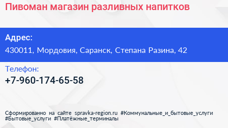 Пивоман, магазин разливных напитков по адресу 430011, Мордовия, Саранск, Степана Разина, 42 в дальнейшем Организация, размещена в следующих категориях: