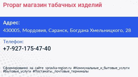 Propar, магазин табачных изделий по адресу 430005, Мордовия, Саранск, Богдана Хмельницкого, 28 в дальнейшем Организация, размещена в следующих категориях:
