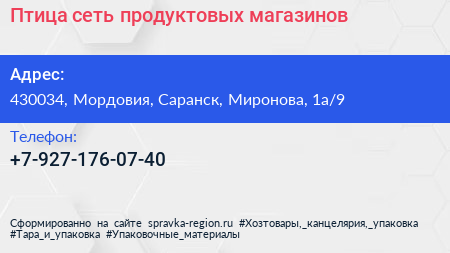 Птица, сеть продуктовых магазинов по адресу 430034, Мордовия, Саранск, Миронова, 1а/9 в дальнейшем Организация, размещена в следующих категориях:
