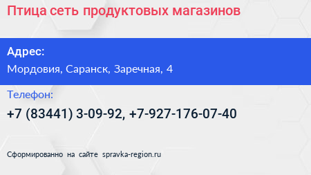 Птица, сеть продуктовых магазинов по адресу Мордовия, Саранск, Заречная, 4 в дальнейшем Организация, размещена в следующих категориях: