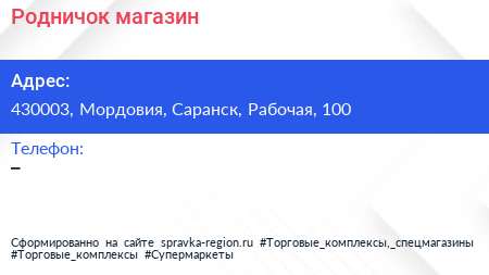 Родничок, магазин по адресу 430003, Мордовия, Саранск, Рабочая, 100 в дальнейшем Организация, размещена в следующих категориях: