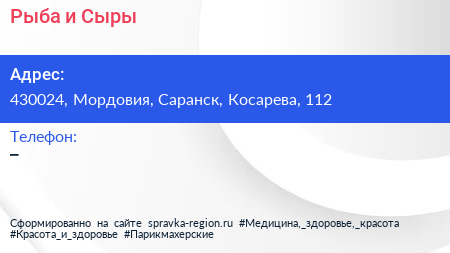 Рыба и Сыры по адресу 430024, Мордовия, Саранск, Косарева, 112 в дальнейшем Организация, размещена в следующих категориях: