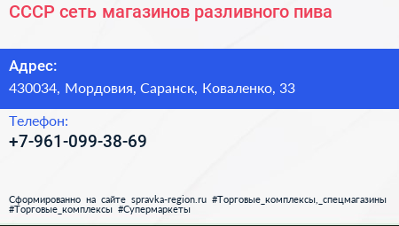 СССР, сеть магазинов разливного пива по адресу 430034, Мордовия, Саранск, Коваленко, 33 в дальнейшем Организация, размещена в следующих категориях:
