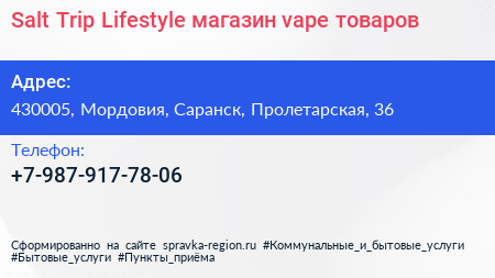 Salt Trip Lifestyle, магазин vape-товаров по адресу 430005, Мордовия, Саранск, Пролетарская, 36 в дальнейшем Организация, размещена в следующих категориях: